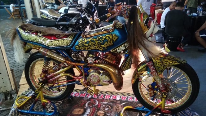 Seperti motor RX King lansiran 2005 yang terpajang di selasar Increase Indonesia, IIMS 2019, JIExpo, Kemayoran. Tunggangan milik pria asal Cirebon bernama Sugandi itu mengusung tema Nusantara dengan menonjolkan kesan mengerikan ala Leak Pulau Dewata.