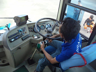 Di bagian depan, ada satu bagian yang tak luput dari perhatian Ridwan, yakni soal kamera mundur yang masih menggunakan layar tabung hitam-putih. Sejumlah panel indikator juga menggambarkan kalau bus ini memang sudah uzur. Tetapi, semua elemen di dasbor dibalut dengan kulit. "Bus ini masih disewakan lho, dalam waktu dekat malah mau dipakai ke Madiun," katanya.