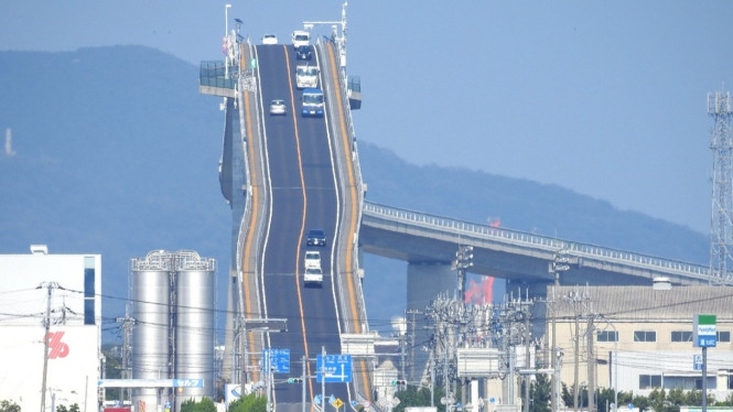 Jembatan yang menghubungkan kota Matsue dan Sukaimoto di Jepang ini memiliki kemiringan yang terbilang gila dan tak masuk akal. Dirancang menjadi dua jalur dengan jarak sepanjang 1,7 kilometer, lintasan yang dijuluki roller coster tersebut mempunyai kemiringan sisi hingga 6,1 persen.