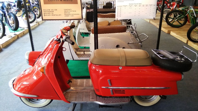 100kpj – Indonesia International Motor Show (IIMS) 2019 tak hanya menjadi panggung bagi pabrikan otomotif masa kini, melainkan juga sebagai ruang nostalgia bagi kendaraan tua yang sempat besar di masanya. Salah satu yang menyita perhatian, adalah skuter Heinkel Tourist.
