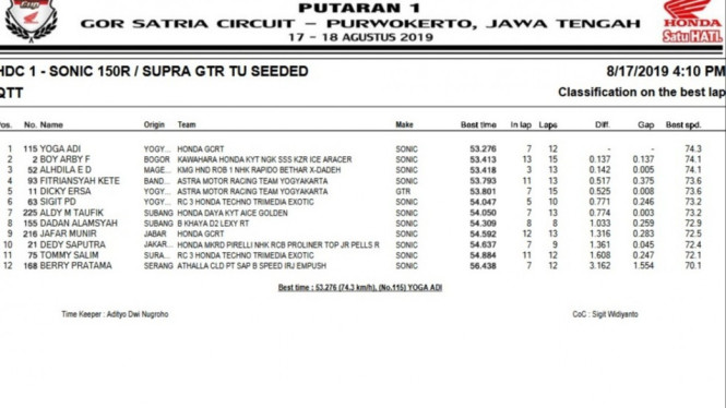 100kpj – Ajang balap satu merek (One Make Race) bertajuk Honda Dream Cup 2019 di Sirkuit GOR Satria telah menyelesaikan babak kualifikasi pada Sabtu 17 Agustus 2019. Total 10 kelas menjalani babak kualifikasi untuk memperebutkan posisi terdepan pada sesi balapan pada Minggu besok.
