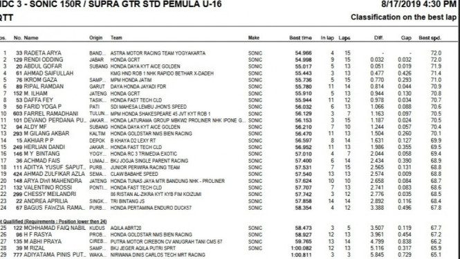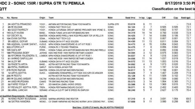 Dan pembalap Jawa Barat dari team Dewasena CLD Racing, Fisichella KW berhasil mengamankan pole position setelah mencatatkan waktu terbaik 59.008 detik. Diikuti Ressa Fauziah dari tim CMRT Bengkulu Lalayspeed yang terpaut 0.742 detik dari Fisichella. Posisi start ketiga diamankan Suci Mulyani (Jawa Timur) dari tim America Racing Boy Polres Belu yang terpaut 0.882 detik dari Fisichella.