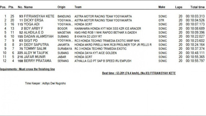 Fitriansyah Kete berhasil finish pertama dengan catatan waktu 18 menit 03.313 detik dengan catatan waktu terbaiknya 53.201 detik saat melahap lap 3. Pada balapan dengan total 20 lap itu, Fitriansyah mampu tampil lebih cepat 1.212 detik dari rekan setimnya Dicky Ersa.