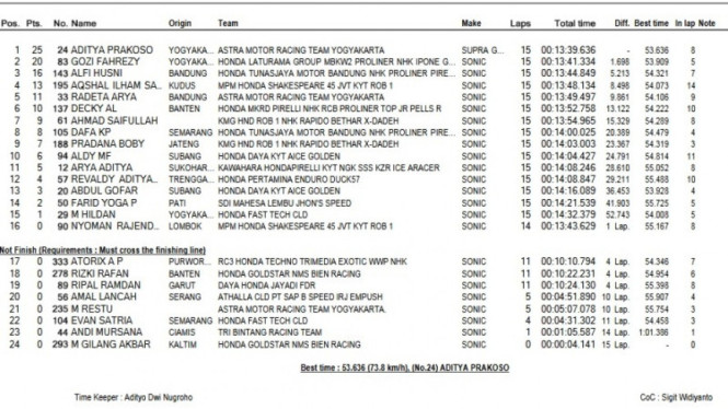 Ketatnya persaingan Ahmad dan Aldy juga terlihat dari selisih waktu kedua pembalap tersebut. Aldy hanya terpaut 0,070 detik. Sedangkan podium 3 berhasil diamankan pembalap Astra Motor Racing Team (ART) Yogyakarta, Radeta Arya yang terpaut 2.535 detik dari sang jawara.