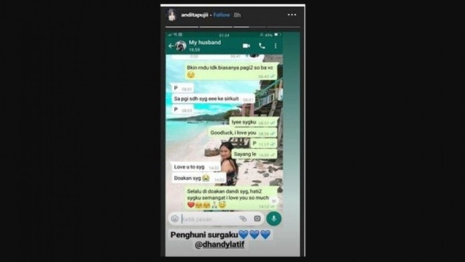“Selalu didoakan, Dhandy sayang. Hati-hati, dan selalu semangat!” ucapnya, melalui tangkapan layar yang ia unggah melalui story di akun Instagram pribadinya.