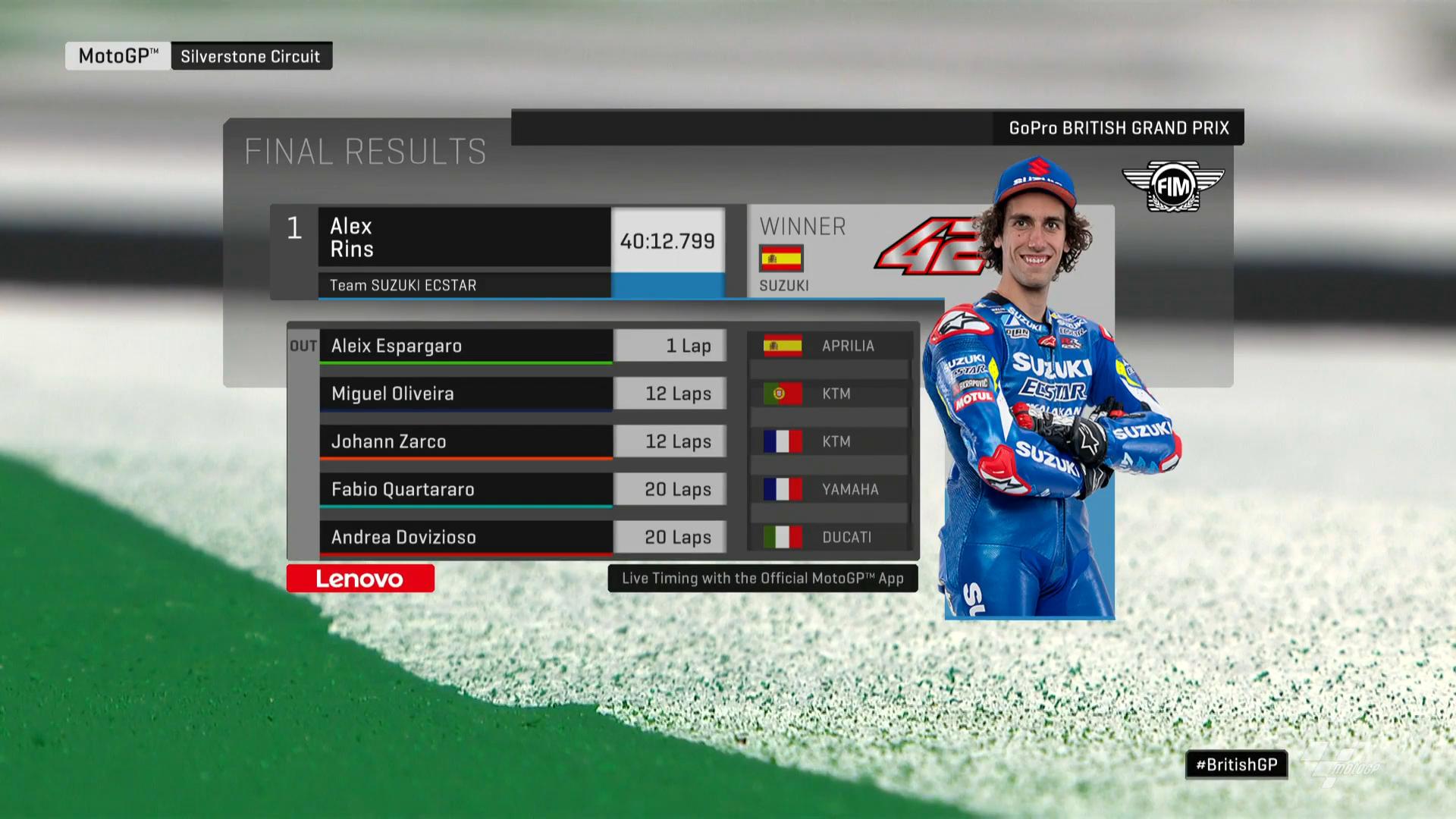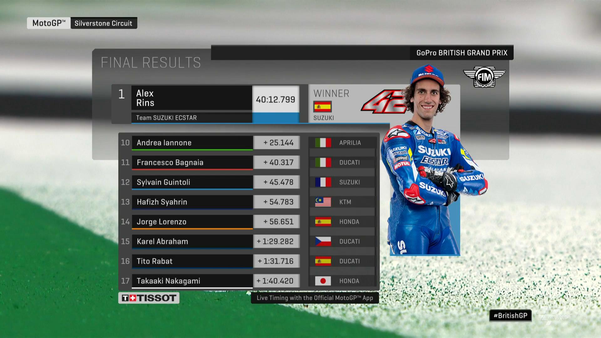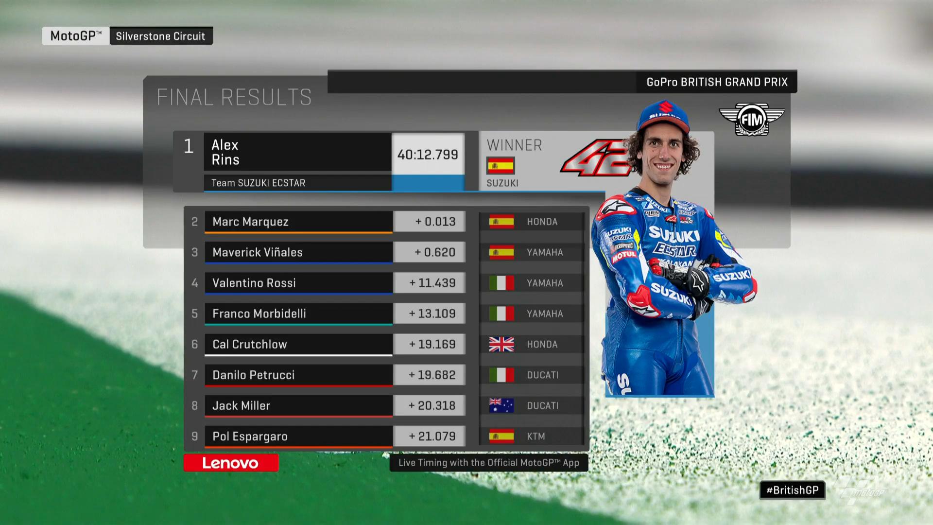 Rins pun akhirnya menyentuh garis finis lebih dulu dan berhak keluar sebagai pemenangnya di seri 12 ini. Sedangkan Marquez harus finis di posisi kedua, dan kalah 0,013 detik saja dari waktu Rins yaitu 40 menit 12,799 detik.