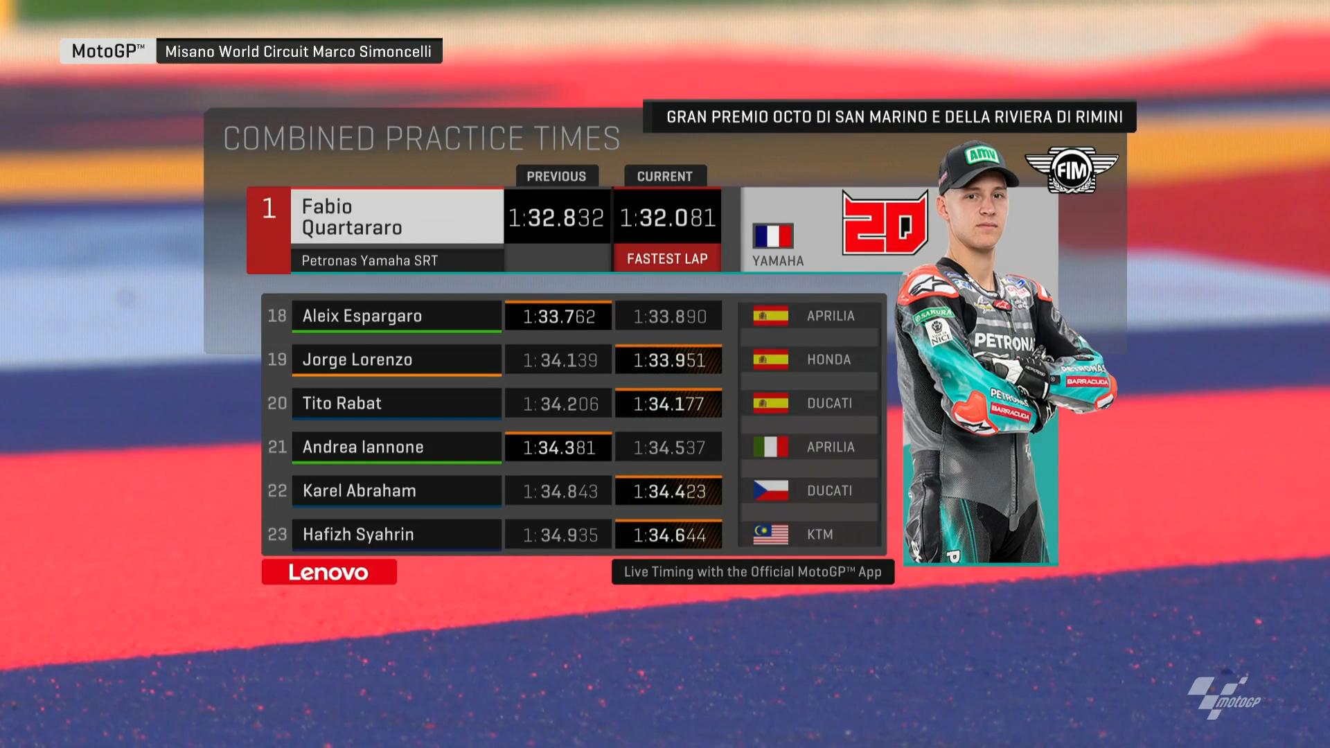 Dalam free practice yang berlangsung di Sirkuit Misano, Quartararo menorehkan waktu 1 menit 32, 832 detik. Sedangkan Vinales membukukan waktu 1 menit 32,775 detik, disusul oleh Pol Espargaro.