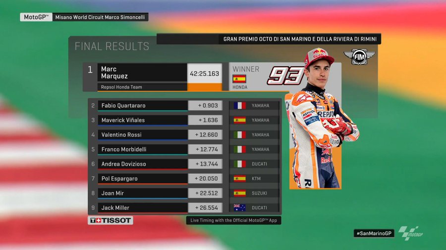 Rekan setim Vinales, Valentino Rossi, meraih posisi keempat dan kalah +12,660 detik dari Marquez. Posisi lima besar ditutup oleh rekan setim Quartararo, Franco Morbidelli.