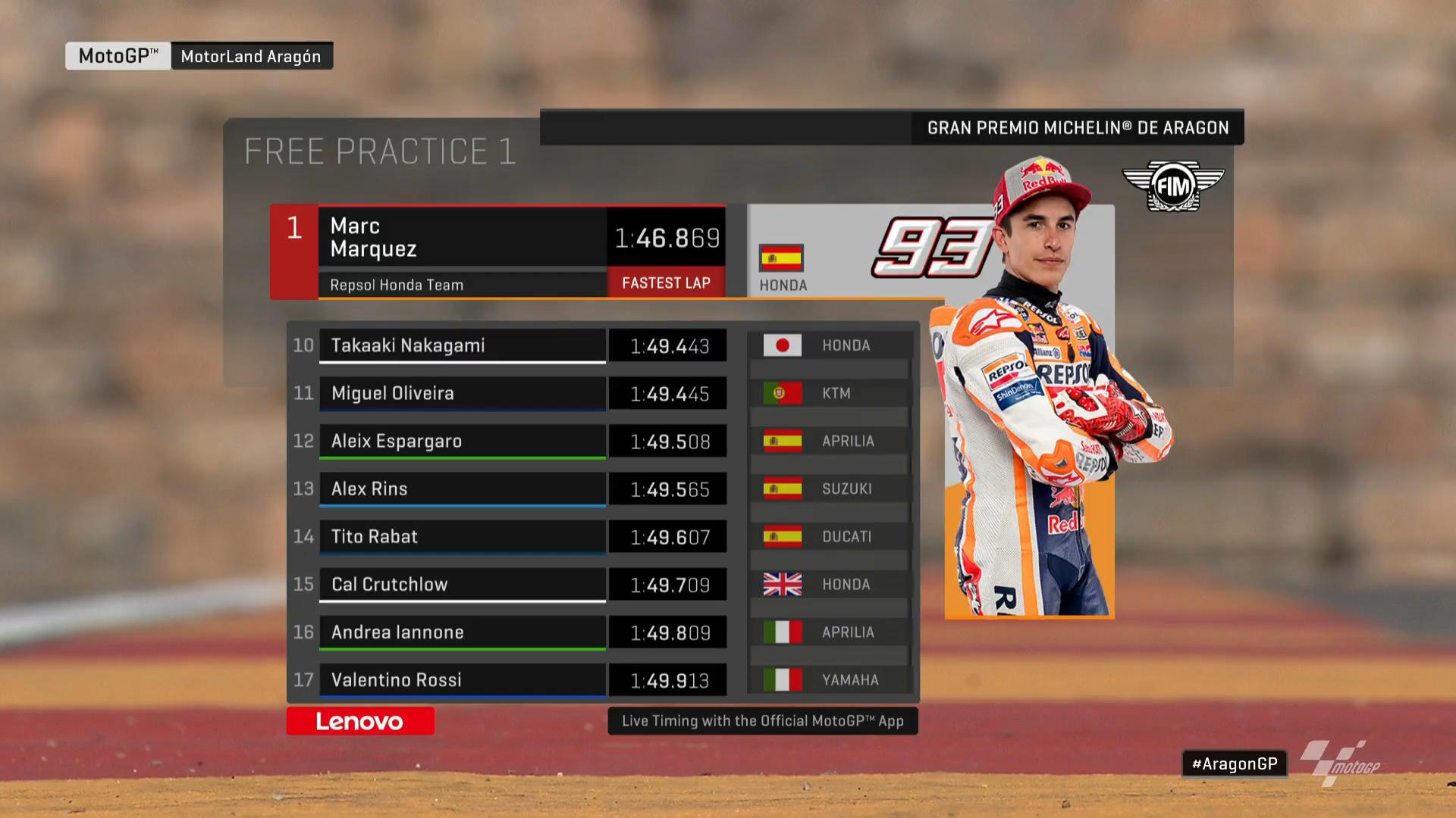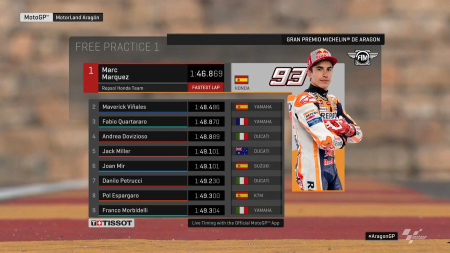 Dalam free practice yang berlangsung di Sirkuit Motorland Aragon, Marquez menorehkan waktu terbaiknya 1 menit 46,869 detik. Pembalap asal Spanyol ini mengalahkan dua pembalap Yamaha, Maverick Vinales dan Fabio Quartararo.